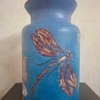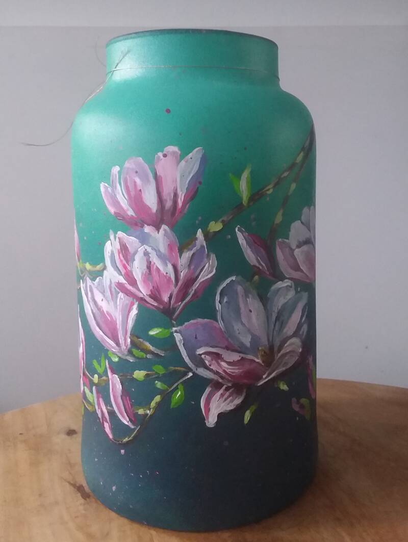 Schilder nu op een glazen vaas aan de buitenkant. De binnenkant wordt gesponst. De vaas is 15 cm hoog en 19 cm breed.