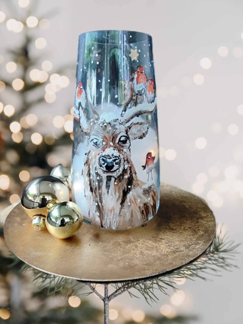 we maken een prachtige glazen kerstvaas met een handgeschilderd kersthert als stralend middelpunt.