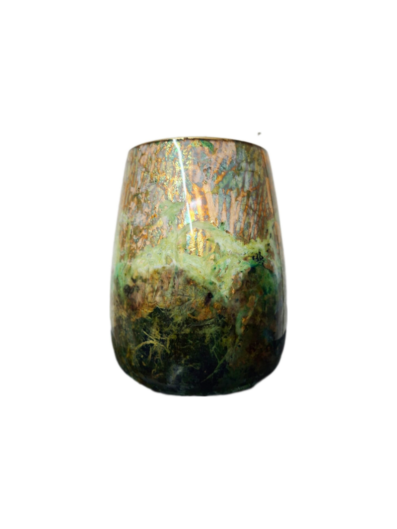 Je gaat aan de slag met blanco *Ricepaper, dat je zelf kleurt met *Bruscho. Daarnaast gebruik je *Paperdeco in een bijpassende kleur, *Pigmenten, Acryl en *Decofolie. Je werkt aan de binnenkant van de vaas. Eerst maak je een proefstuk van 20 x 20 cm, zodat je kunt ontdekken hoe de techniek werkt en wat het eindresultaat zou kunnen zijn.