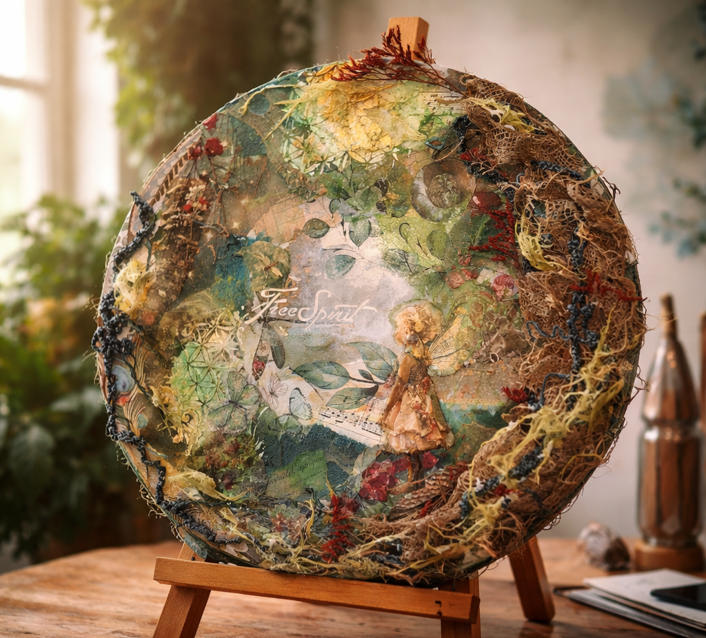 Op deze houten schijf ga je aan de slag met verschillende soorten papier in jouw favoriete kleuren. Vervolgens blenden we het papier om een rustiger en samenhangend geheel te creëren. Daarna werk je verder met sjablonen, pasta, inkten en aquarelpotloden om jouw creatie tot leven te brengen.