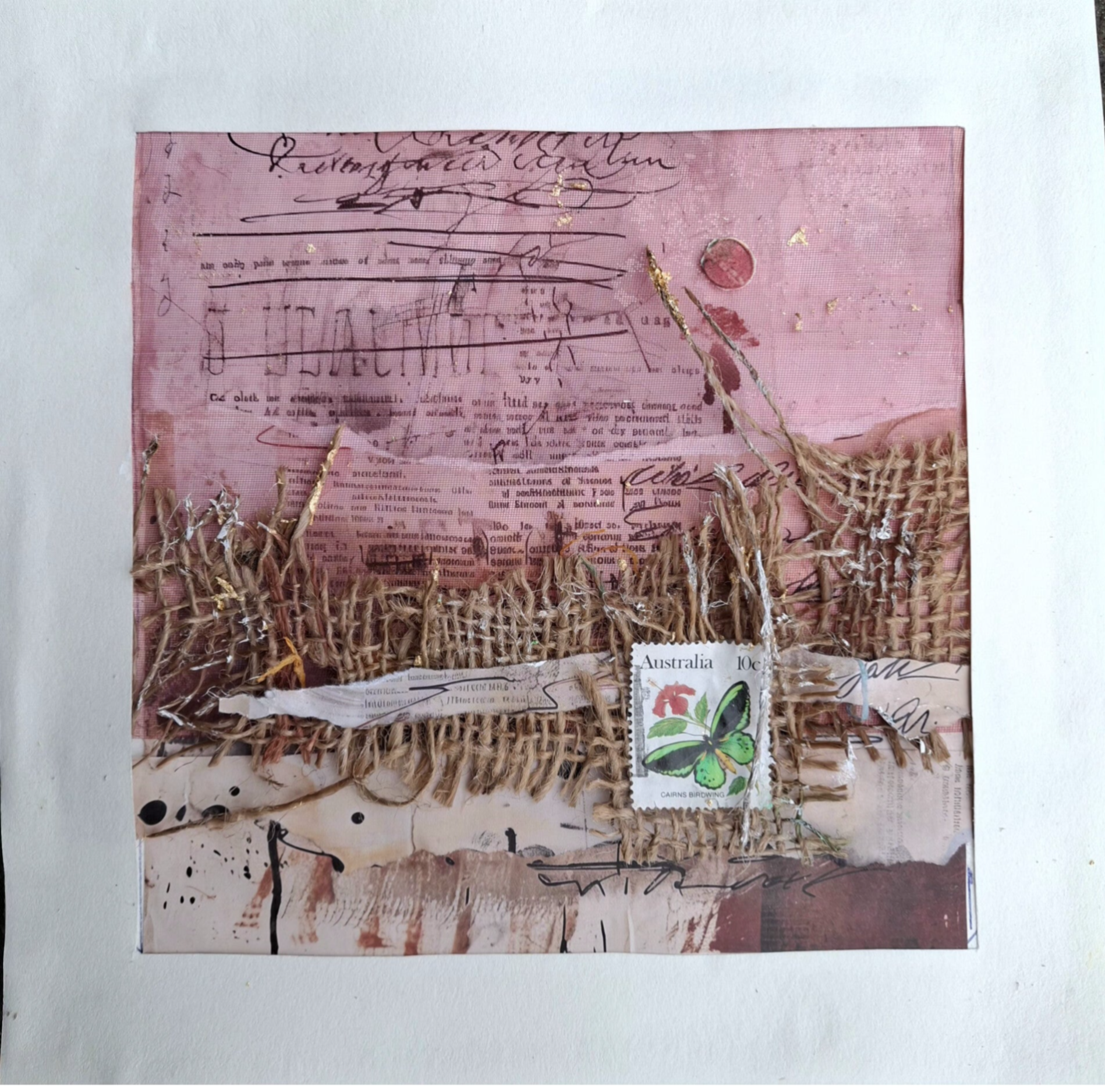 In dit voorbeeld zijn gebruikt: twee stukjes papier, organza voor kleur, een stukje jute, een postzegel, een vleugje goudfolie en een beetje acrylverf. Binnen 2 uur maak je een prachtig 'Les is More'-schilderijtje!