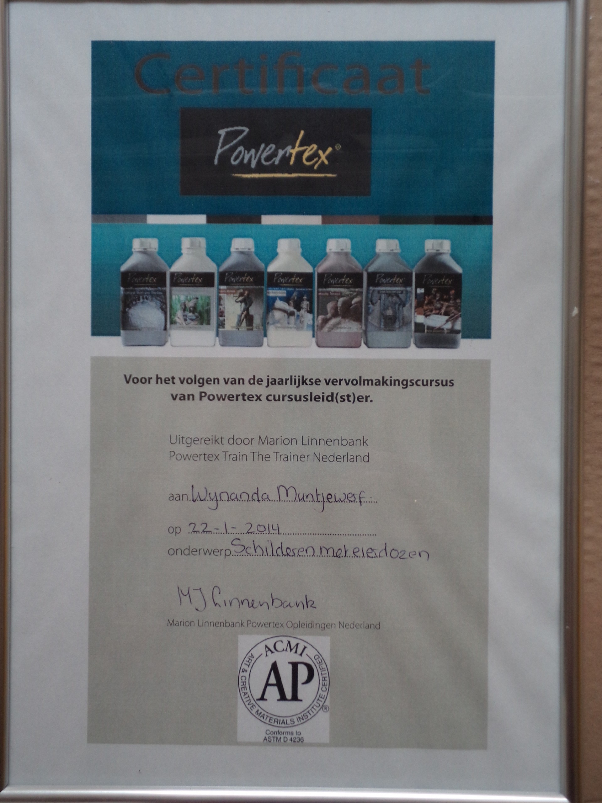 Mijn naam is Wijnanda Muntjewerff, ik ben de eigenaresse van Atelier Wel-Creatief en docente tijdens de creatieve workshops. Creatief bezig zijn is mijn grote passie. Al ruim twintig jaar specialiseer ik mij in het werken met variërende technieken, waaronder het veelzijdige Powertex, waar ik mijn Master Degree in heb behaald. Door de jaren heen heb ik een eigen stijl ontwikkeld.