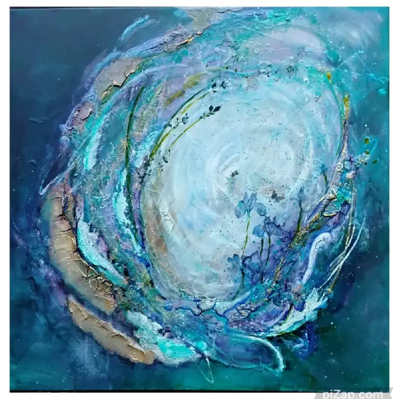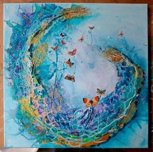 Dit werkstuk is 50 x 50 en gemaakt met Powertex easy 3D flex, een poeder dat je mengt met Powertex tot een pasta, op kleur te brengen met diverse mediums. Met een palletmes breng je de pasta aan, waarna bij droging barstjes (craquelé) ontstaan. In dit voorbeeld is ook een kant-en-klare pasta gebruikt die geen barstjes geeft, gecombineerd met goudkleurige pasta die wel barst. Zo kun je verschillende technieken combineren. Na 1 dag drogen kun je het werkstuk verder afwerken. Kies je eigen kleuren; de eerste opzet duurt ongeveer 4 uur, met een vervolg voor de afwerking.